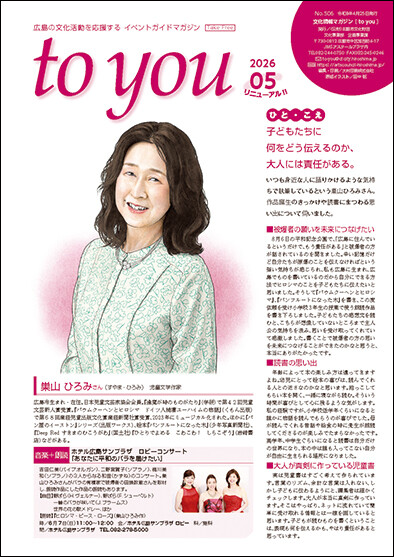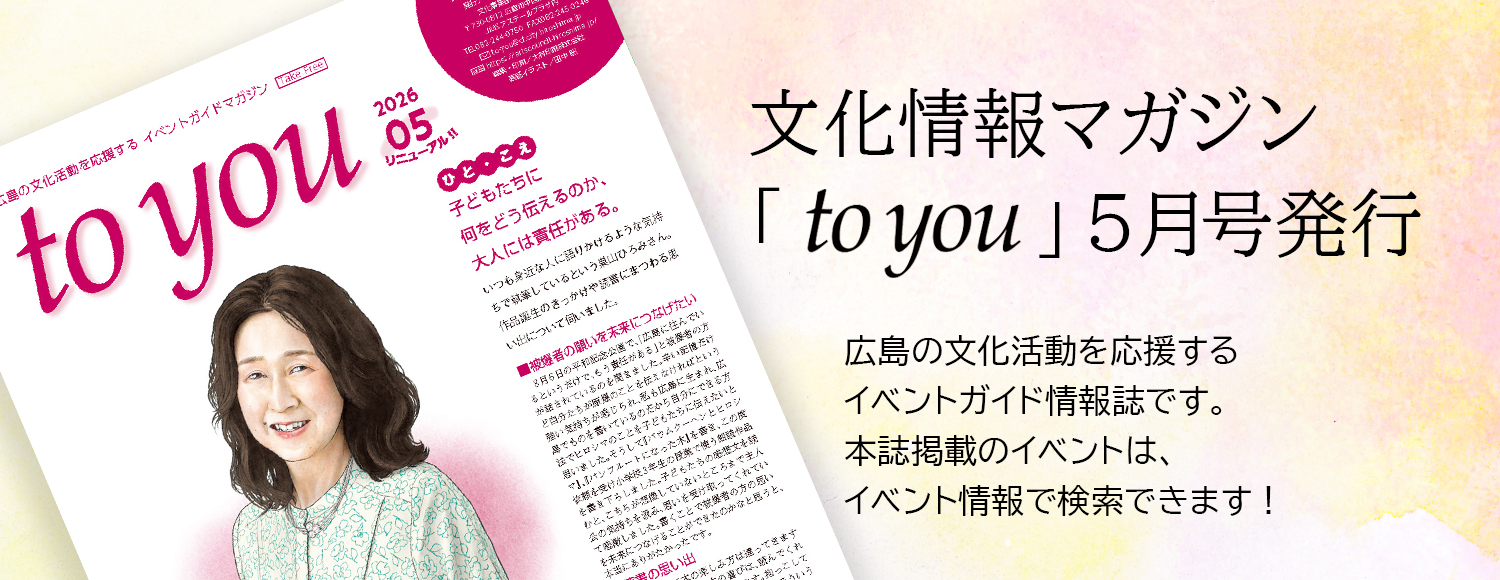 お寄せいただいた情報のうち、広島市内で開催されるイベントについては、文化情報マガジン「to you」紙面の「ひろしまカレンダー」にも掲載します。