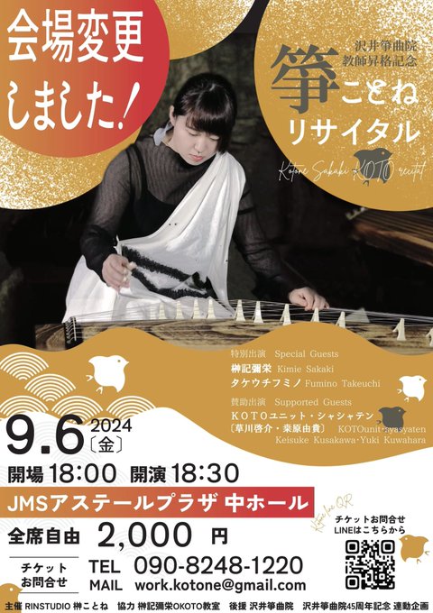 広島県内外で箏の演奏活動をしている榊ことねが、沢井箏曲院 教師の昇格記念として箏リサイタルを開催します。ゲストに榊記彌栄(箏・十七絃)、タケウチフミノ(二胡・フィドル)を迎え、KOTOユニット・シャシャテン(箏・十七絃)も賛助出演。