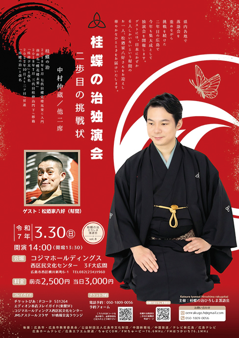 県内各地で落語会を重ね、挑戦を続けてきた桂蝶の治さんが、二年目の広島で今年も集大成として独演会を開催します!