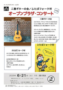 「二葉ギターの会」と「ふたばフォーク村」の合同で行います。「二葉ギターの会」はさまざまなジャンルの音楽をギターアンサンブルでお届けします。「ふたばフォーク村」は60 年代から80 年代の懐かしのフォークソングをお届けします。