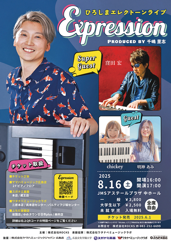 広島を拠点に活動中のアーティスト「大瀬戸千嶋」の千嶋里志さんがプロデュースを手掛ける初ライブ。ゲストは、エレクトーン界のトップアーティストで、全米でも活躍中の窪田宏さん。第一部は千嶋さんのソロ、そして広島のchickeyさん、明神あみさんとのコラボステージ。第二部は窪田さんのソロ&千嶋さんとのスペシャルセッション。曲はホルストの「木星」など。