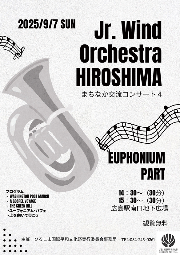 ひろしま国際平和文化祭実行委員会が実施する広島広域都市圏在住の中高生を対象とした音楽教育プログラム「ジュニアウインドオーケストラ広島プロジェクト」受講生によるコンサート。