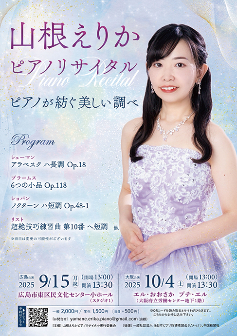 武蔵野音楽大学大学院を修了し、広島新人演奏会で優秀演奏者賞を受賞した山根えりかのリサイタル。これまでの音楽人生で特に心を揺さぶられたショパン、シューマン、ブラームスなどの名曲を厳選し、演奏家自身の深い想いとともにお届けします。