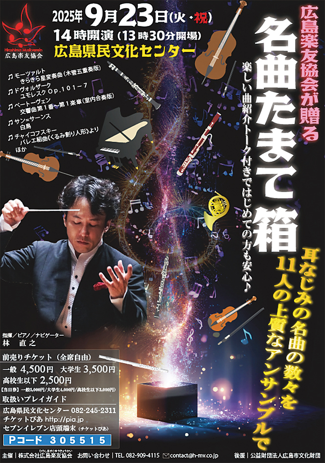 広島の指揮者・林直之さんが立ち上げた「広島楽友協会」。これまで数々のプロ演奏家たちが参加してきた。今回は11人の演奏家が出演(弦楽器5名、管楽器5 名、ピアノ1名)。「フルオーケストラの曲の最少人数での再現を目指します」と主催者。演目は多くの人になじみ深い、モーツァルトやチャイコフスキーなどの名曲選。コンサートマスターには、元広島交響楽団の田野倉雅秋さん。