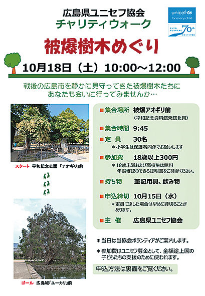 毎年10月開催の人気イベント「チャリティウォーク」。今年は被爆樹木めぐりで、平和公園内の「被爆アオギリ」~基町~広島城のルートを約2時間で歩きます。参加費は全額ユニセフ募金として途上国のこどもたちの支援のために使われます。