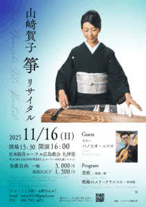 エリザベト音楽大学大学院を修了して1年が経過し、今回が2度目のリサイタル。ゲストにはフィリピン出身のギター奏者パノピオ・ニコロさんを迎える。17絃独奏の他、箏とギターの為に作られた作品、映画音楽などをアレンジした作品を披露する。