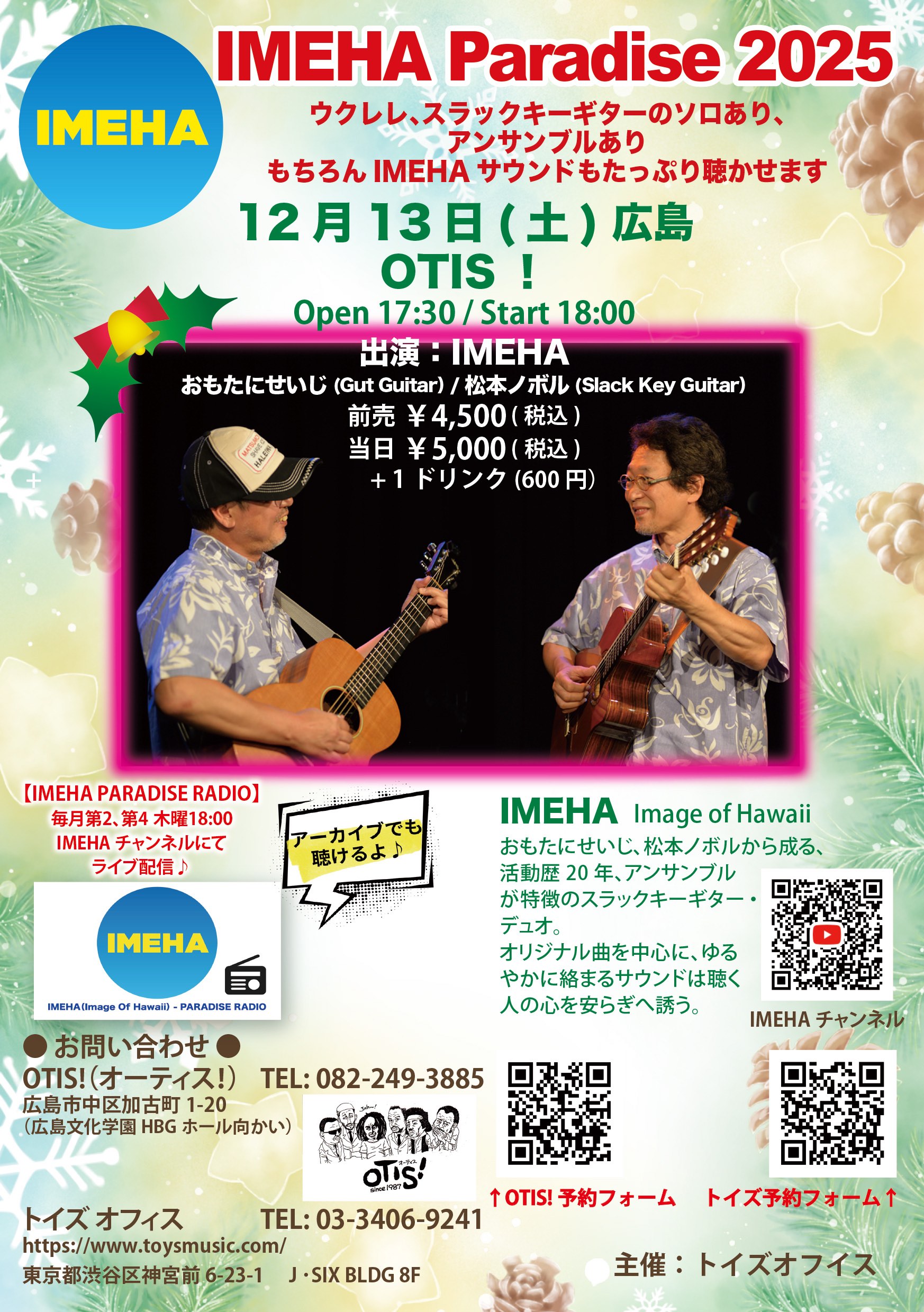 ウクレレ、スラックキーギターのソロあり、アンサンブルあり、もちろんIMEHA サウンドもたっぷり聴かせます!
