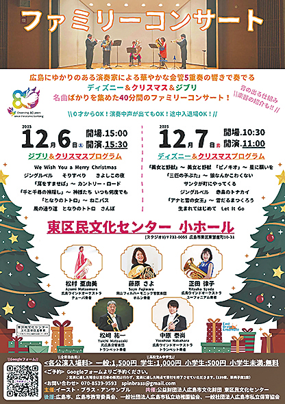 広島にゆかりのある演奏家による金管5重奏で、ディズニー&クリスマス&ジブリの名曲をお届けします。0歳から入場でき、演奏中声が出ても、途中入退場OKな演奏会です!
