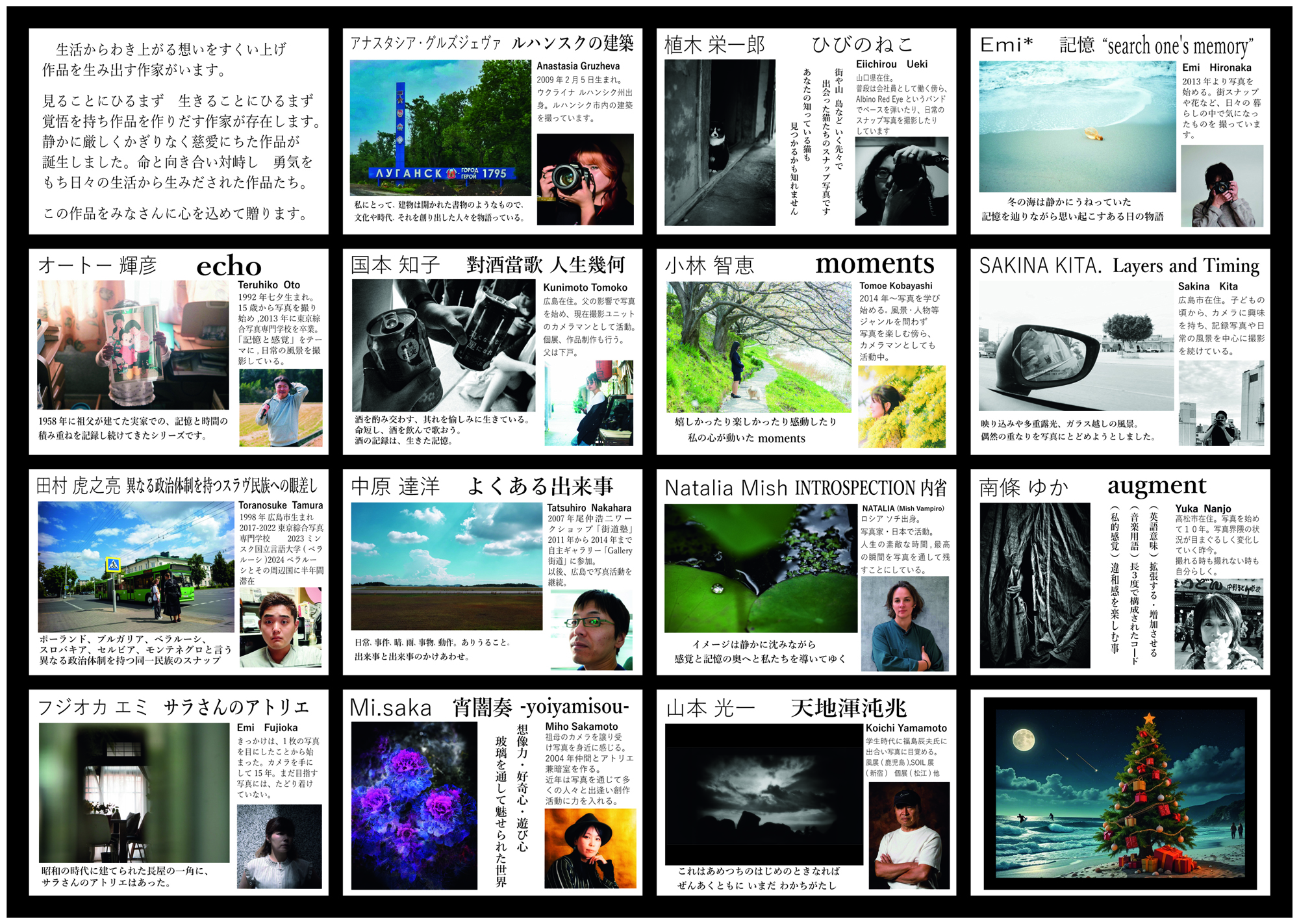 出品者:アナスタシア‧グルズジェヴァ(ルガンスク ウクライナ)、植木栄一郎(山口県下松市)、Emi*(広島市)、オートー 輝彦(広島市)、国本知子(広島市)、小林智恵(広島市)、SAKINA KITA. (広島市)、田村虎之亮(広島市)、中原達洋(広島市)、2Natalia Mish(東広島市)、南條ゆか(香川県高松市)、フジオカ エミ(広島市)、Mi.saka(広島市)、山本光一(広島市)