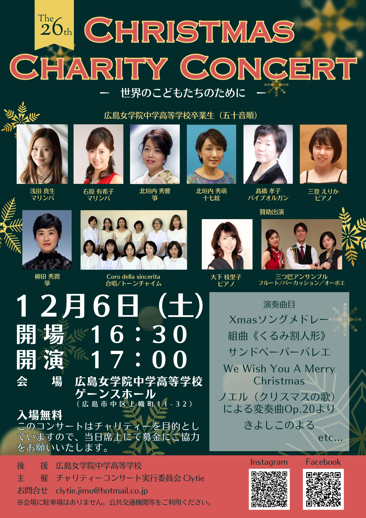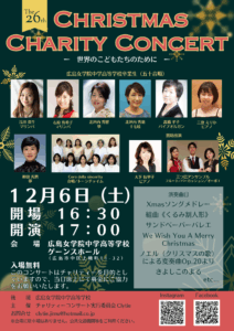 広島女学院中学高等学校卒業生による第26回クリスマスチャリティコンサートを開催します。お子様連れも大歓迎です。