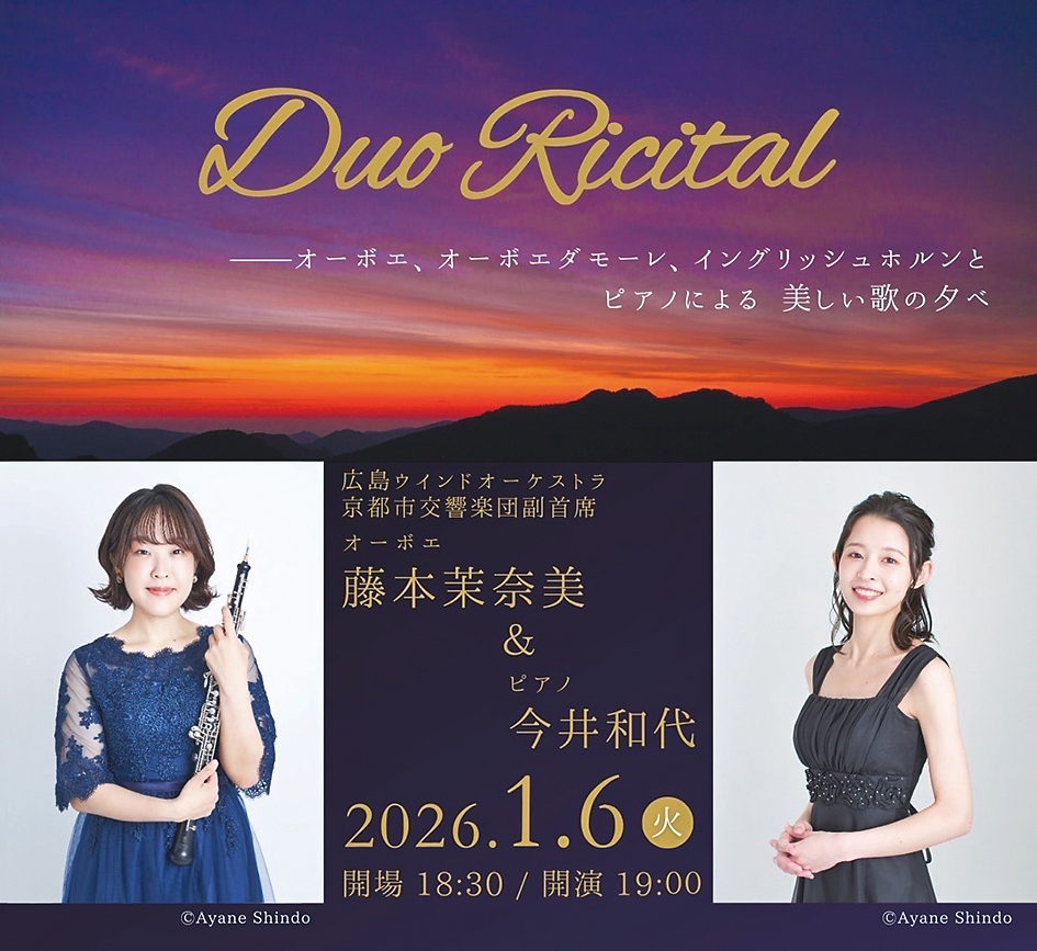 オーボエ奏者の藤本茉奈美さん(広島ウインドオーケストラ・京都市交響楽団副首席)と、ピアニスト今井和代さん(広島市出身)。5年かけ親交を深めた2人による、初のデュオリサイタル。テーマは「歌」。シューマンの「幻想小曲集op.73」(オーボエダモーレ版)、歌曲「女の愛と生涯」より抜粋ほかを披露。オーボエ属の多彩な音色を楽しめそう。