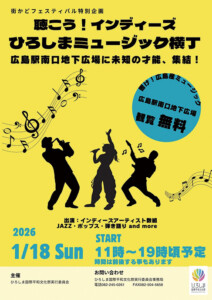 ひろしま国際平和文化祭実行委員会は、インディーズ音楽シーンの活性化を目的として、ライブパフォーマンスイベントを開催します。JAZZ、ポップス、弾き語りなどの地元アーティストが登場します!
