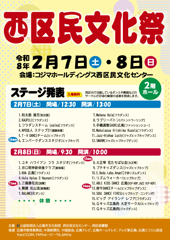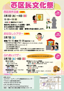 西区内で活動している団体によるステージ発表や、西区内で創作活動を行っている方などの作品展、障害者福祉団体などが製作した手工芸品の展示販売など、楽しい催しが目白押しです。