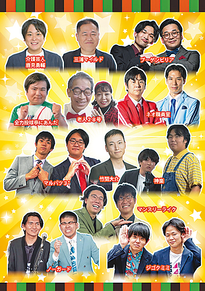 介護芸人として活躍中の鹿見勇輔氏プロデュース。めぐみエンターテインメントと2025年に発足した広島バラエティ協会より若手から実力派芸人12組が登場。R-1グランプリ2013覇者も!ぜひお越しください。