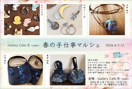 参加作家:おりでちせ(イラスト雑貨/陶製アクセサリー)、久保玲子(藍染小物)、重森理恵(藍染小物)、中谷アート社(金工アクセサリー/イラスト雑貨)、正岡雅子(蜻蛉玉/硝子アクセサリー)
