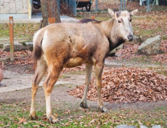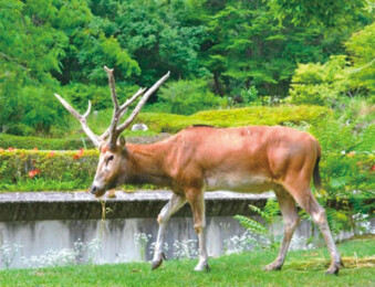 “シフゾウ”という動物を知っていますか? 名前に“ゾウ”とついているので、あの鼻の長いゾウの仲間を思い浮かべる方も多いかもしれません。写真の立派な角を見て気がついた方もいると思いますが、シフゾウの正体は中国原産のシカの仲間です。宮島などで目にするニホンジカの体長が1.0~1.6m、体重が40㎏~100㎏程であるのに対して、シフゾウの体長は1.5m~2.0m、体重が150㎏~200㎏とかなり大型のシカです。シフゾウという名前は「4つの動物の特徴をもつが、そのどれでもない動物」という意味で「四不像(シフゾウ)」が由来となっています。角はシカ、蹄ひづめはウシ、顔がウマ、尾はロバ、確かに見比べてみると、どの動物とも似ており、不思議な雰囲気があります。