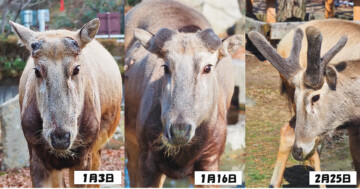 角の成長過程。日に日に伸び、5~6月にかけて完成します。角は骨組織でできていますが、成長途中は皮膚で覆われて、成長が止まると硬くなります。