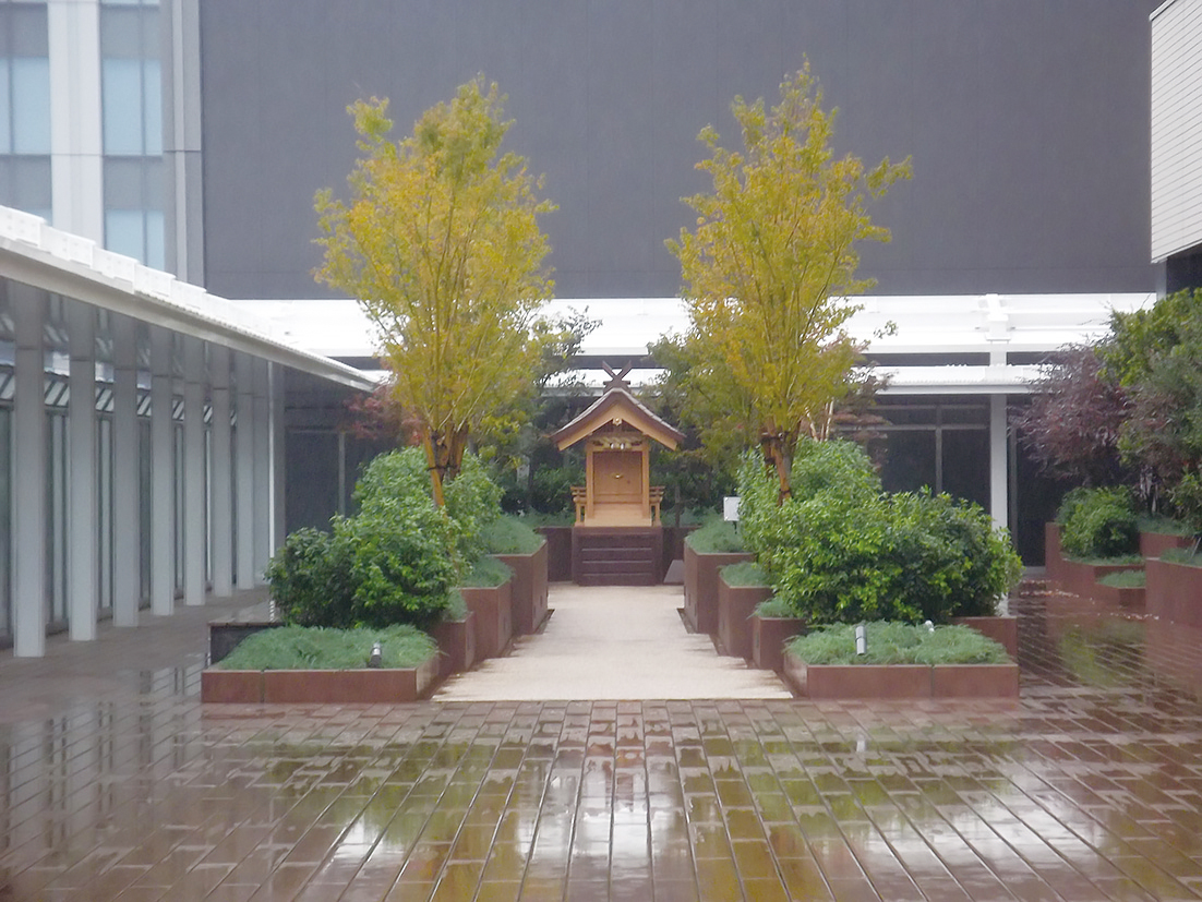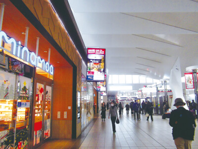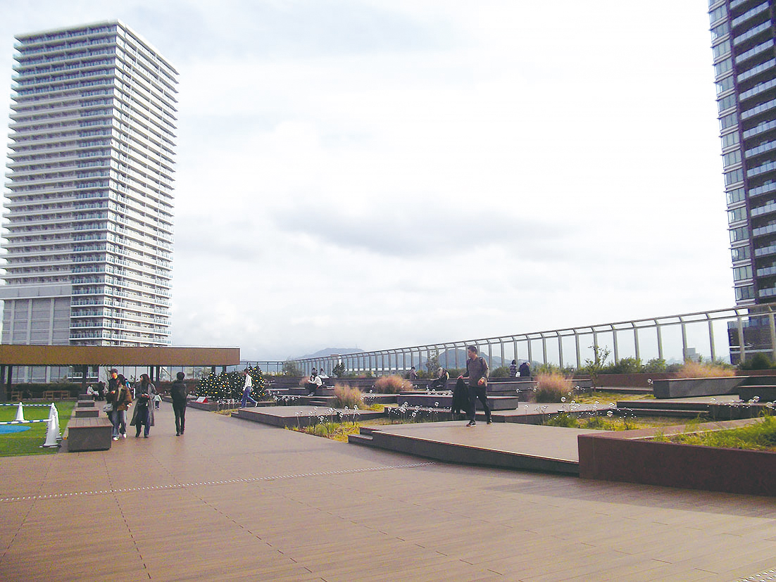 4120平方メートルの屋上は「ソラモア広場」と名付けられ、植栽が成長するまでの現況は一見して「原っぱ」であるが、この自由度のある「原っぱ」にはさまざまな利用の可能性を感じる。木製の台座に腰かけて開放的な気分に浸れる都会の「穴場」のような気がした。屋上から7F「ウッドデッキ広場」に降りる大階段からの眺望も見所だろう。南側は駅前通りを一望でき、北側は二葉の里の変貌する姿が一望できる。ウッドデッキから室内に入る大階段付近の通路の壁面に、駅ビル新築工事に携わった7683名の名前を刻んだプレートが張り付けてある。気付かず通り過ぎてしまうこの壁の銘鈑は、これから続くミナモアの歴史の原点として立ち止まって見てほしいところだ。