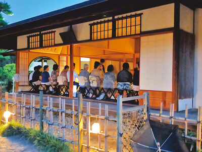 秋の訪れを感じる縮景園の園内で、日本古来の風習として秋の名月を愛でる観月茶会が開催されます。開園時間を延長し、行灯の薄明りの中、昼間とはひと味違った歴史ある庭園の夜の趣を堪能してください。