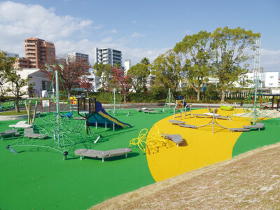 大型複合遊具をはじめ、あらゆる子どもが楽しめるインクルーシブ遊具や芝生、屋内休憩所のある広場。小さな子どもが安心して練習できる専用の「キックバイクゾーン」(3月末まで)があり、自転車の練習がてら親子でのんびり過ごすのにピッタリのエリアです。