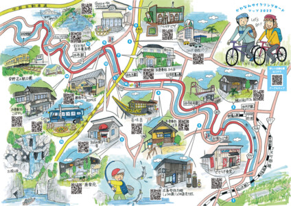 コース沿いの飲食店や旧可部線駅が載っているイラストマップ。QRコード付なので正確な位置もわかります。